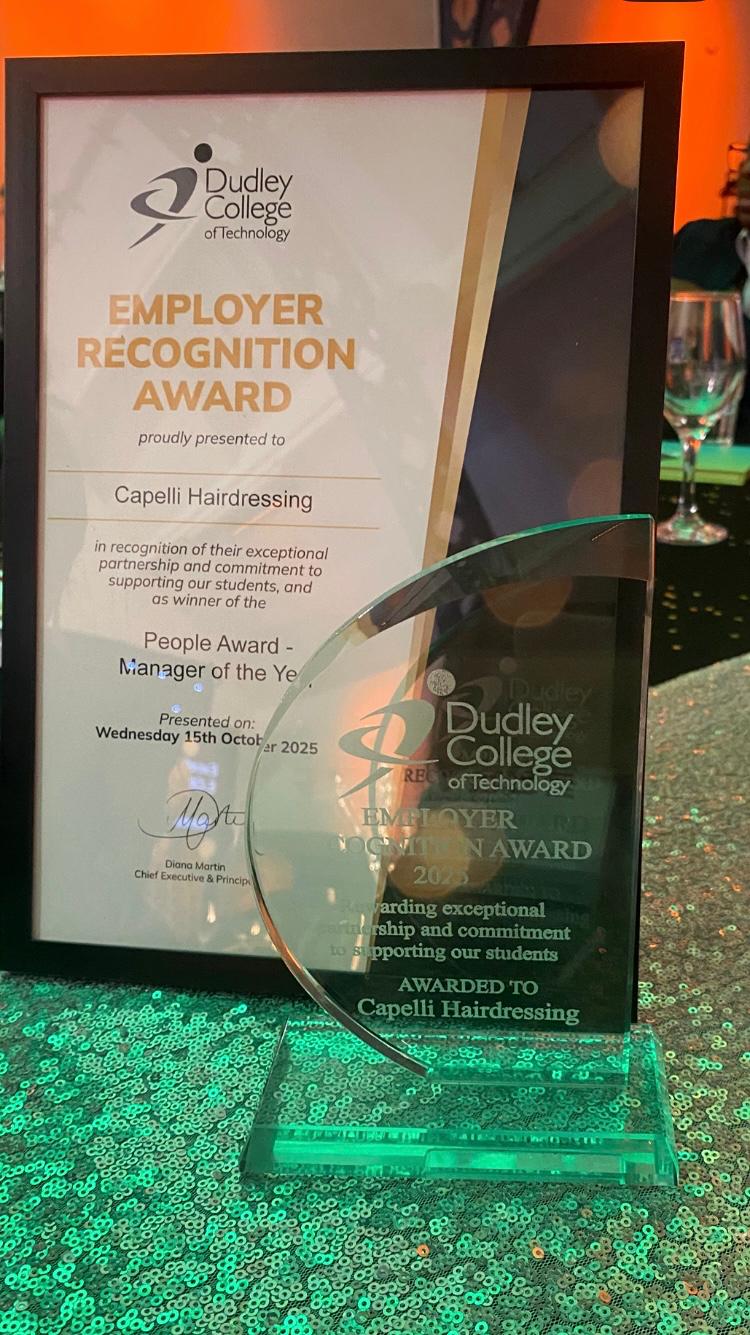 Great news – After many years working with Dudley College nurturing and coaching hairdressing apprentices, Capelli Hairdressing has been awarded – ‘People award, Manager of the Year’ 2025.